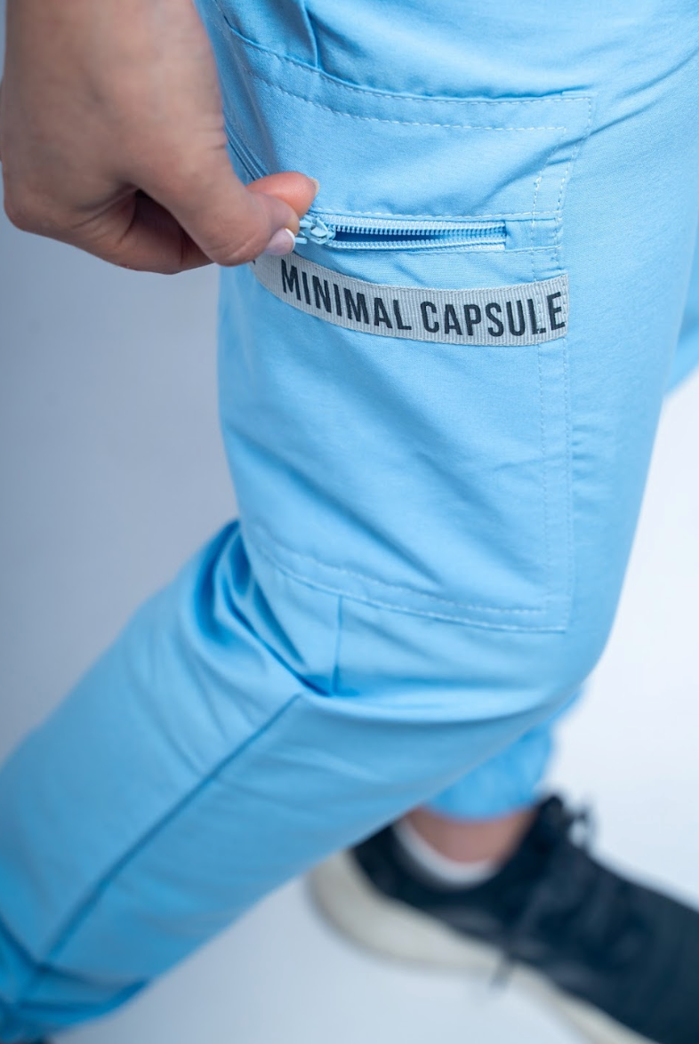 Uniforme azul claro en tela antifluido cloro resistente.